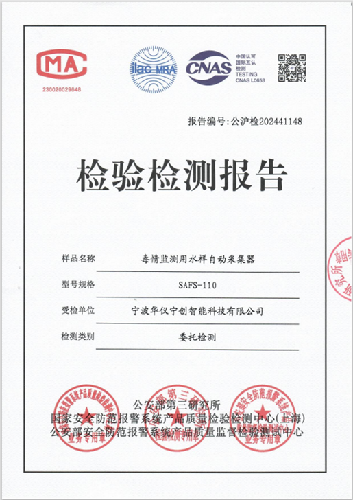 近日,華儀寧創基于國產原創技術研發推出的毒情監測用水樣自動采集器SAFS-110經過各項關鍵指標評測后,順利獲得公安部警用裝備檢測認證。該款設備是業內第一款滿足《中華人民共和國公共安全行業標準-監測用水樣自動采集器(征求意見稿)》內所有技術要求污水采樣器,且每項關鍵指標均獲得公安部認證。