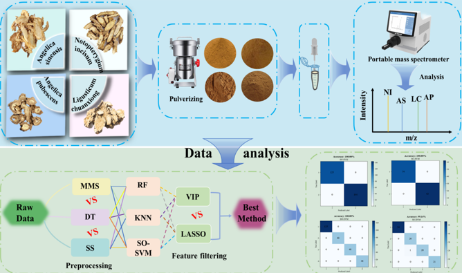 為進一步提升便攜式質譜儀在中藥材摻偽檢測中的普適性和應用范圍,該研究團隊將研究重點拓展至當歸。由于考慮到當歸在市場上存在多種形態相似、質量低劣的摻假藥材,因此該團隊模擬了4種摻假手段,通過構建SO-SVM與LASSO優化算法對采集數據進行分析,成功識別出多種摻偽標志離子,實現對當歸及摻假樣品的準確分類。該模型準確率高達99%,大幅提升了摻偽檢測的靈敏度和實用性,有效支持中藥材市場的質量監管與安全保障。實驗流程如圖4所示。