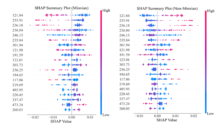 為增強融合模型的可解釋性,團隊引入了基于博弈論的SHAP(Shapley additive explanations)方法,解析模型中各離子峰對分類結果的貢獻度(圖3)。結果表明,來自PMS的特征變量在區分不同產地樣品中占據主導作用,為模型提供關鍵判別依據。該方法有效揭示了質譜數據中對產地溯源最具判別力的m/z特征,為道地藥材的成分研究與可解釋性算法提供理論支撐。